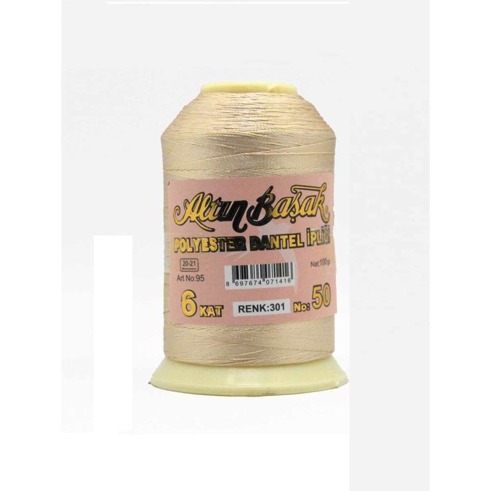 Altınbaşak 50 No: 301 100 GramPolyester Dantel İpliği, üstün kalitede %100 polyester içerir. Dayanıklı ve uzun ömürlüdür. Renk değişimine ve solmaya karşı yüksek direnç gösterir.
