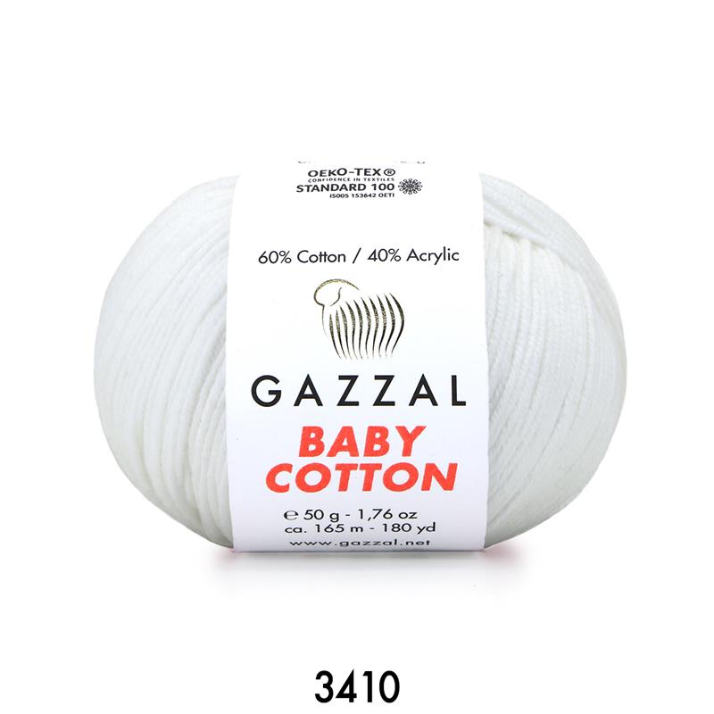 Gazzal Baby Cotton 3410 Kırık Beyaz *Ürün İçerikleri: %60 Pamuk %40 Akrilik *Gramaj: 50g *Metraj: 165 m *Mevsim: İlkbahar / Yaz / Sonbahar / Kış * Şiş No : 3 - 4 * Tığ No : 2 - 3 *Kullanım Alanları: Bebek giysileri. amigurumi. battaniye. kazak. şapka. patik vb. ürünler *Uyarı: Ekranda gözüken renkler ile gerçek iplik rengi farklılık gösterebilir.