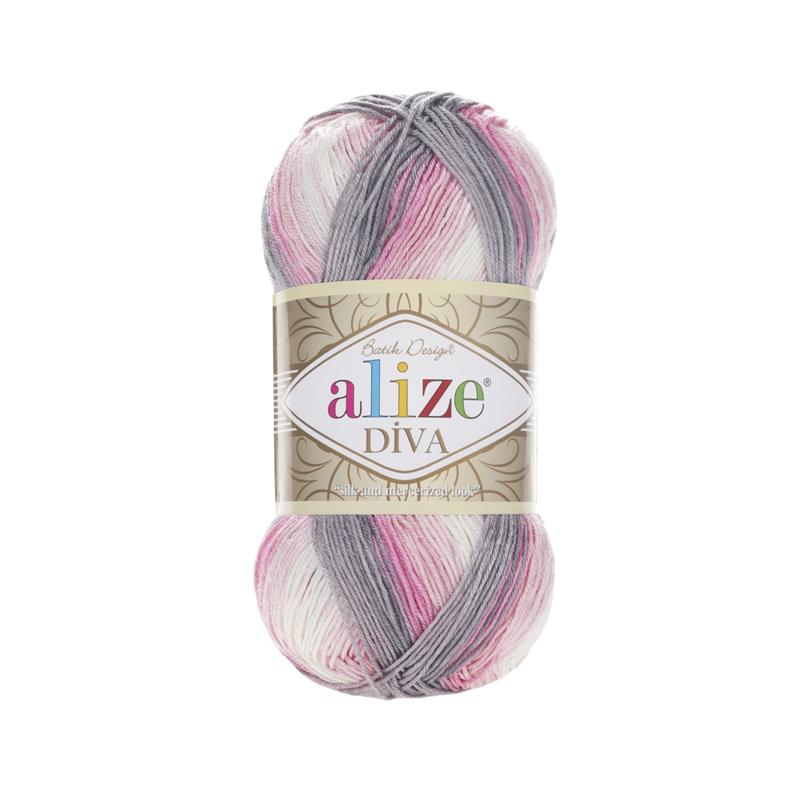 Alize Diva Batik 3245 Pembe-Gri, yazlık bikini, tunus işi yelek, şal, bluz, çanta, battaniye, aksesuar ve ev tekstili gibi birçok projede güvenle kullanabilirsiniz.