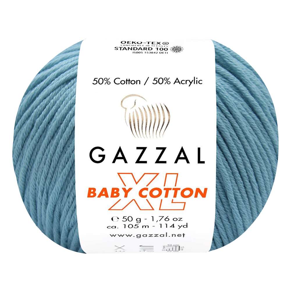 Gazzal Baby Cotton XL 3451 Açık Turkuaz *Ürün İçerikleri: %50 Pamuk %50 Akrilik *Gramaj: 50g *Metraj: 105 m *Mevsim: İlkbahar / Yaz / Sonbahar / Kış * Şiş No : 4 – 4.5 * Tığ No : 3 - 4 *Kullanım Alanları: Bebek giysileri. amigurumi. battaniye. kazak. şapka. patik vb. ürünler *Uyarı: Ekranda gözüken renkler ile gerçek iplik rengi farklılık gösterebilir.