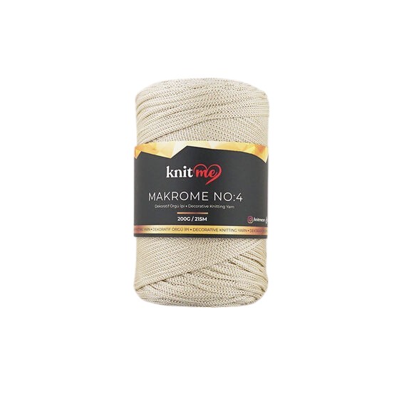 Knit Me No:4 Polyester Makrome *Ürün İçerikleri: %100 Polypropylene *Gramaj: 200 gr *Metraj: 215 m. Şiş No : 4 –7 * Tığ No : 4 - 6 *Kullanım Alanları: Çanta,dekoratif ürünler ve aksesuar gibi örgü modellerinde farklılık yaratmak için bu seriyi güvenle tercih edebilirsiniz. *Uyarı: Ekranda gözüken renkler ile gerçek iplik rengi farklılık gösterebilir.