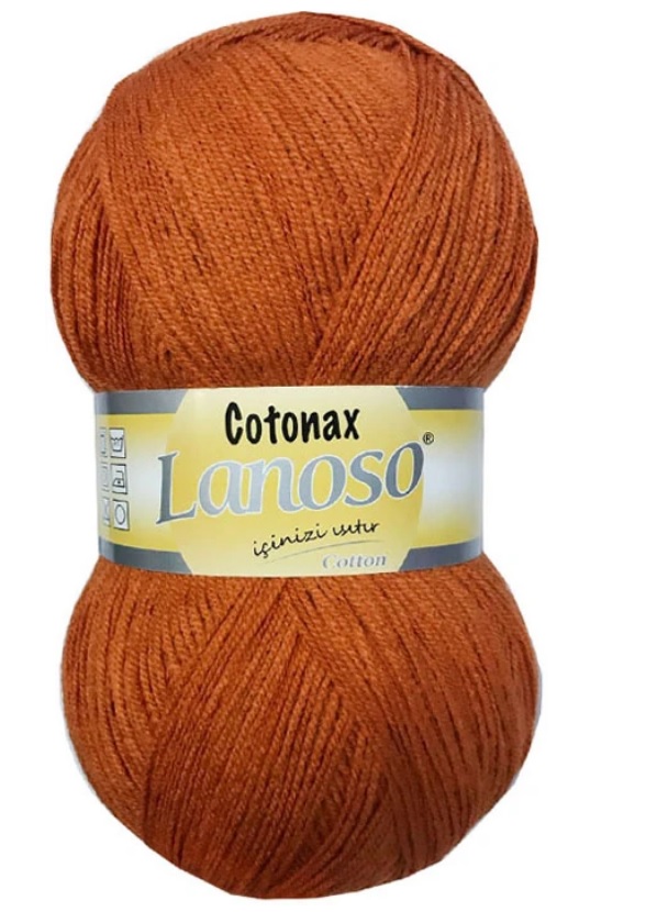 Lanoso Cotonax *Ürün İçerikleri:%50 Pamuk %50 Akrilik Gramaj:100 gr *Metraj: 850 m.* Şiş No 2- 3 mm Tığ No:2- 2.5 mm. Pamuk içeriğe sahip bu örgü ipini tüm örgü modellerinizde kullanabilirsiniz.30 derece suda yıkanabilir. Uyarı: Ekranda gözüken renkler ile gerçek iplik rengi farklılık gösterebilir.