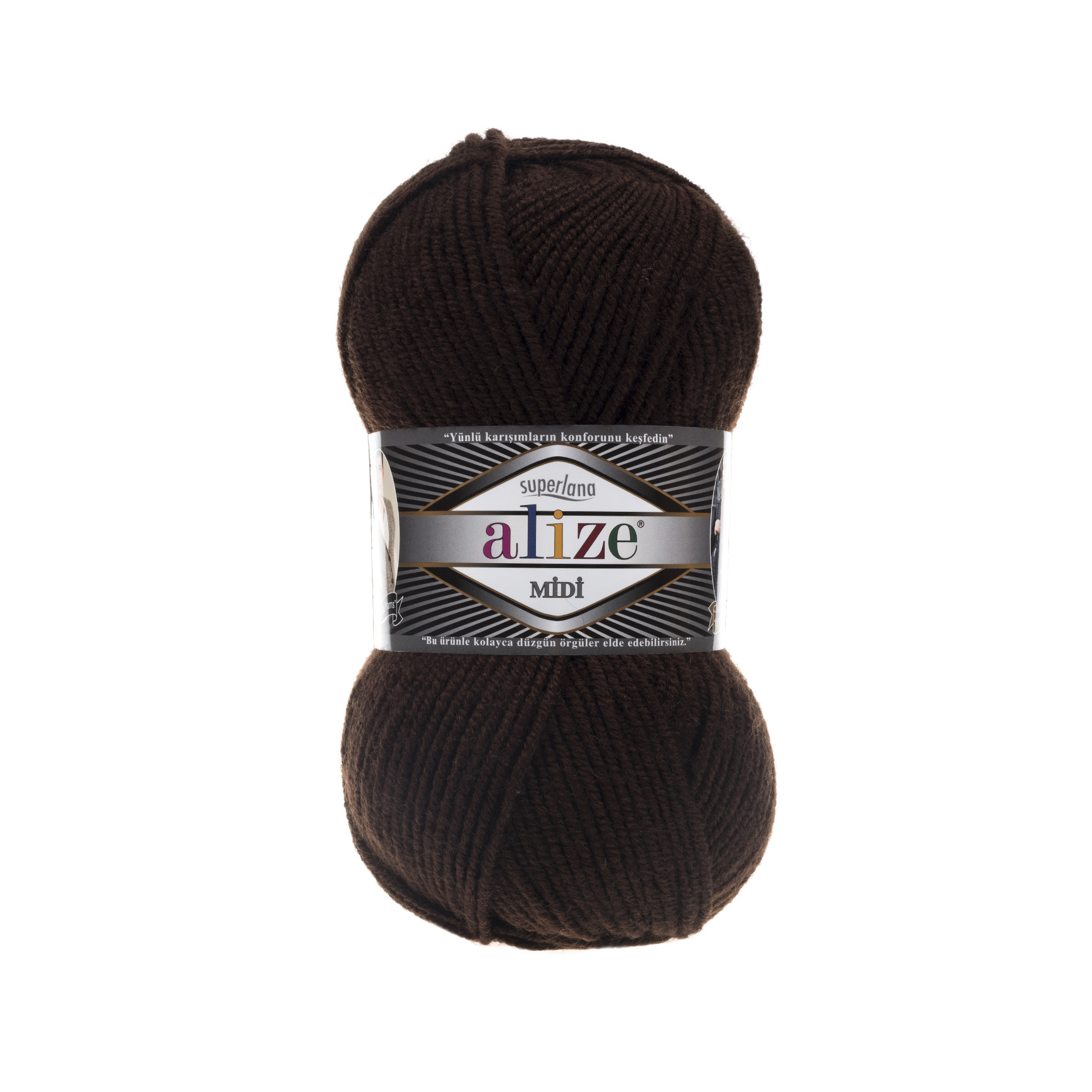 Alize Süperlana Midi 26 Kahve *Ürün İçerikleri: %25 Yün %75 Akrilik *Gramaj: 100 gr *Metraj: 170 m *Mevsim: Sonbahar / Kış * Şiş No : 5 - 7 * Tığ No : 2 - 4 *Kullanım Alanları: Hırka. kazak. atkı. bere yelek. bluz vb. örgülerinizde farklılık yaratmak için bu seriyi tüm örgü modellerinde güvenle tercih edebilirsiniz. *Uyarı: Ekranda gözüken renkler ile gerçek iplik rengi farklılık gösterebilir.