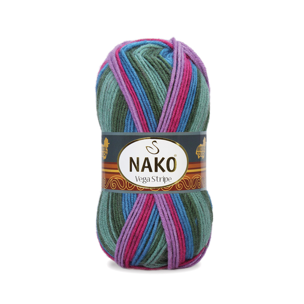 Eşsiz dokusu ve çarpıcı renkleri ile Nako Vega Stripe 82408, çoraplar, şallar, hırkalar ve daha fazlası gibi birçok örgü projesine hayat verir.